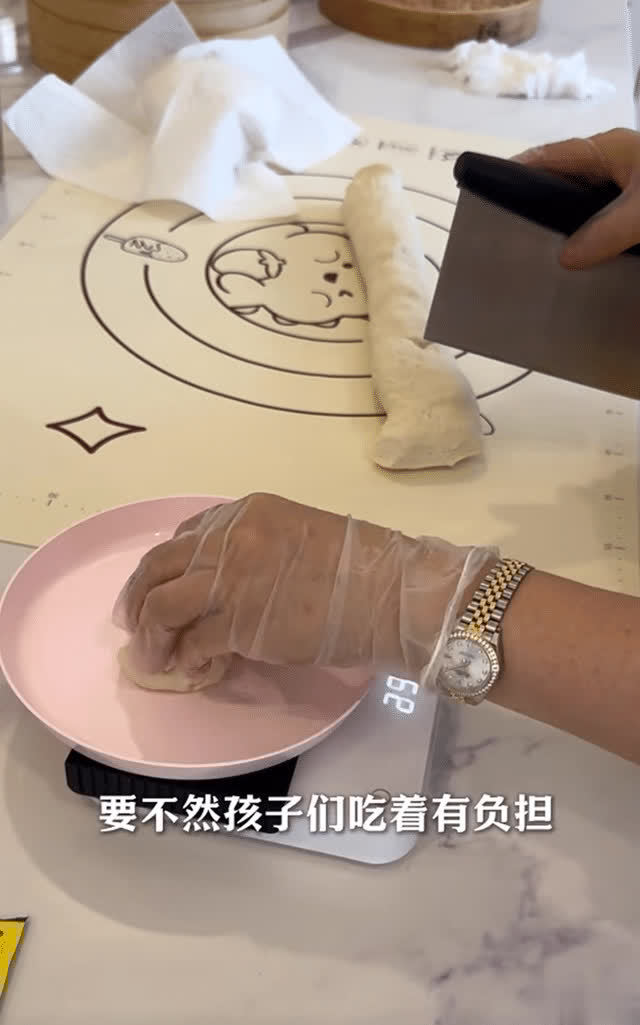 只见面板旁边还放着一个小秤,李念婆婆将分好的面剂子一一放在里面称,对此,婆婆一边操作一边解释称做馒头一个面剂子有60g就行,要不然孩子们吃着就有负担,一看就是个心思很细腻的人。